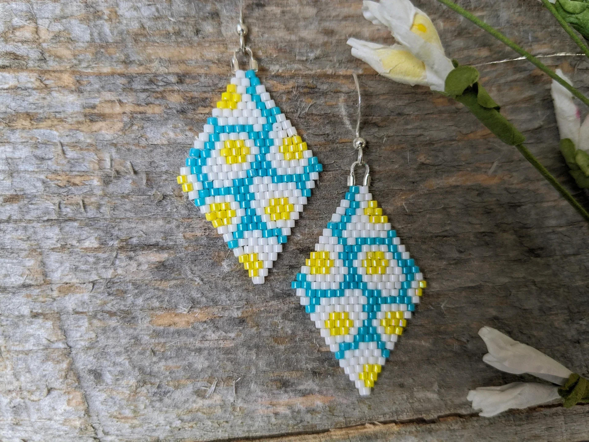 Fun and quirky egg themed rhombus shaped earrings. Thin and lightweight, these won’t weigh down your ears even with all day wear. Large enough to still stand out. Brick stitched and hand woven.