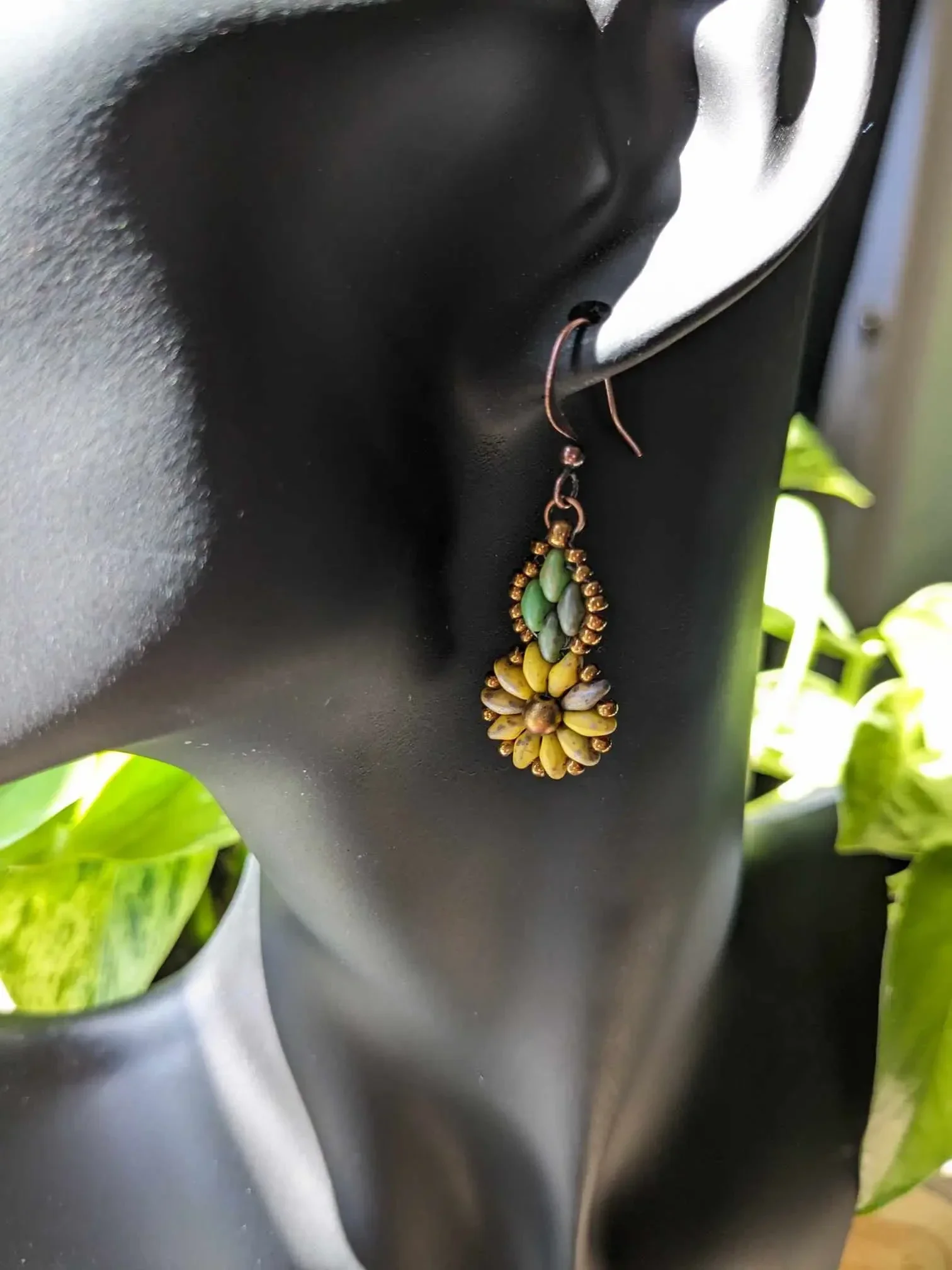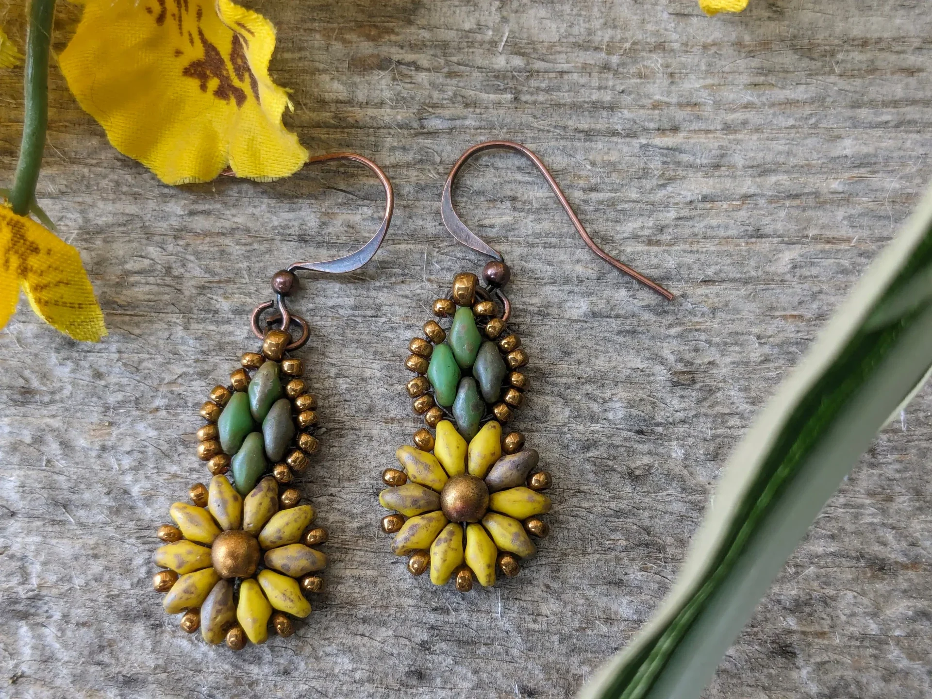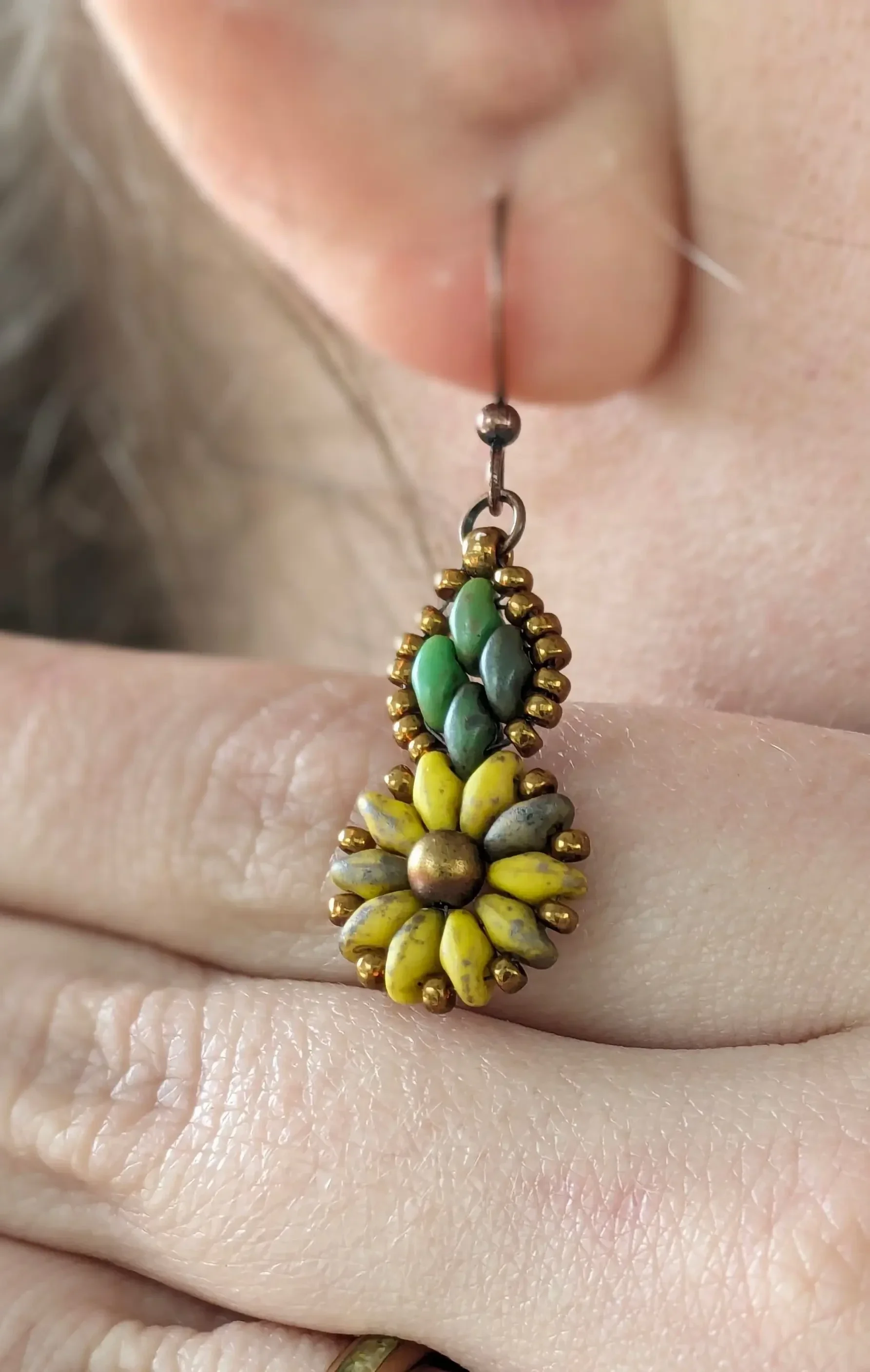 Sunflower earrings in yellow and green with a matte Picasso finish. Perfect small, lightweight, everyday dangle earrings in a rustic boho style.
