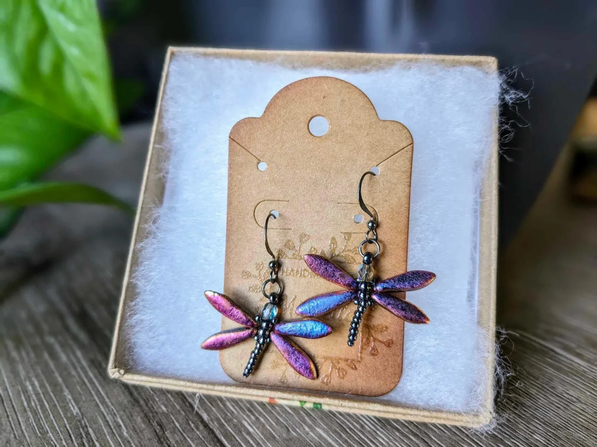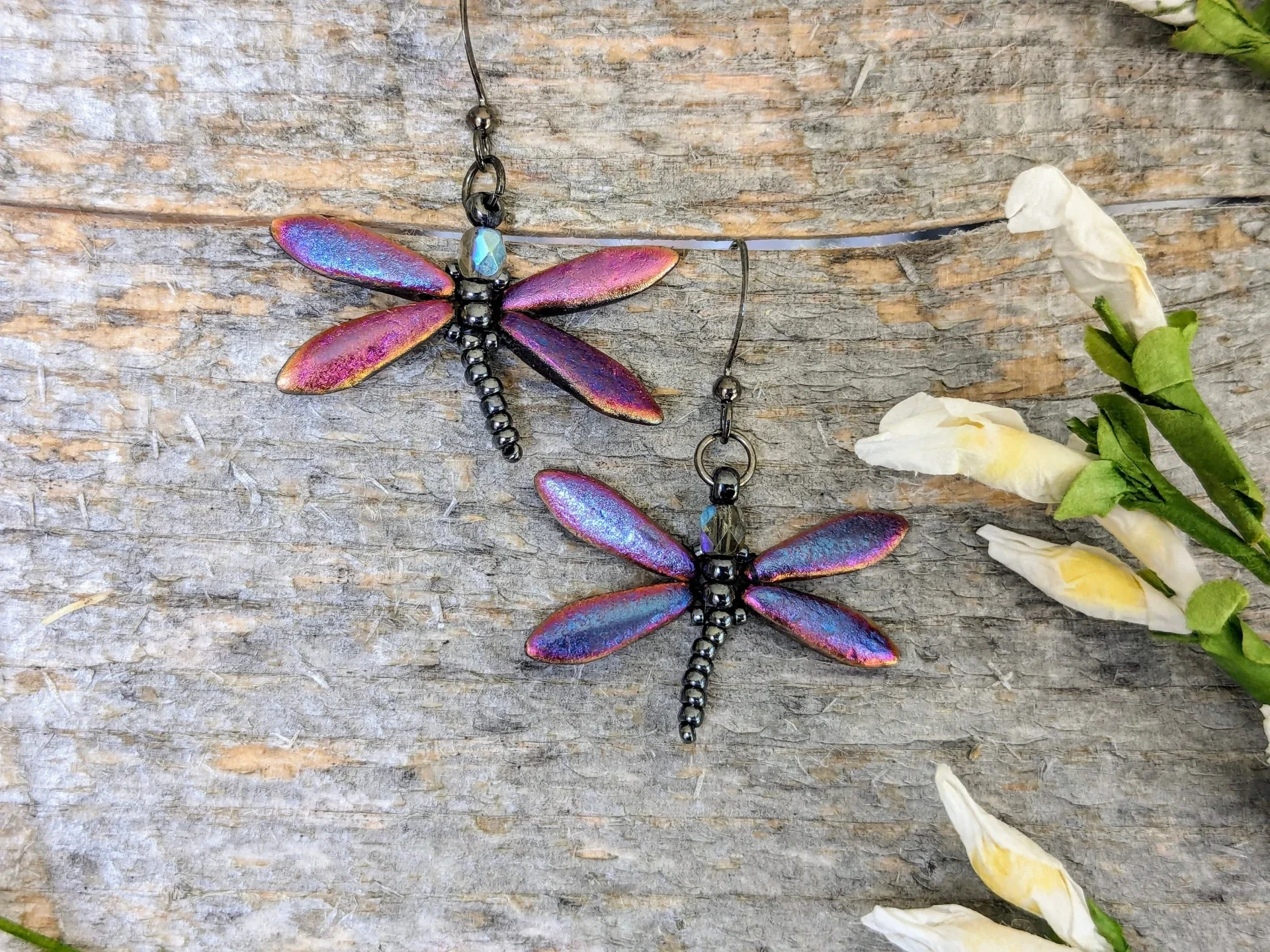 Iridescent dragonfly dangle earrings that change color depending on angle and light. Colors that show include pink, red, purple, blue, orange. Accented with a fire polish bead for the head. Ear wire in a gunmetal plated surgical steel as shown.