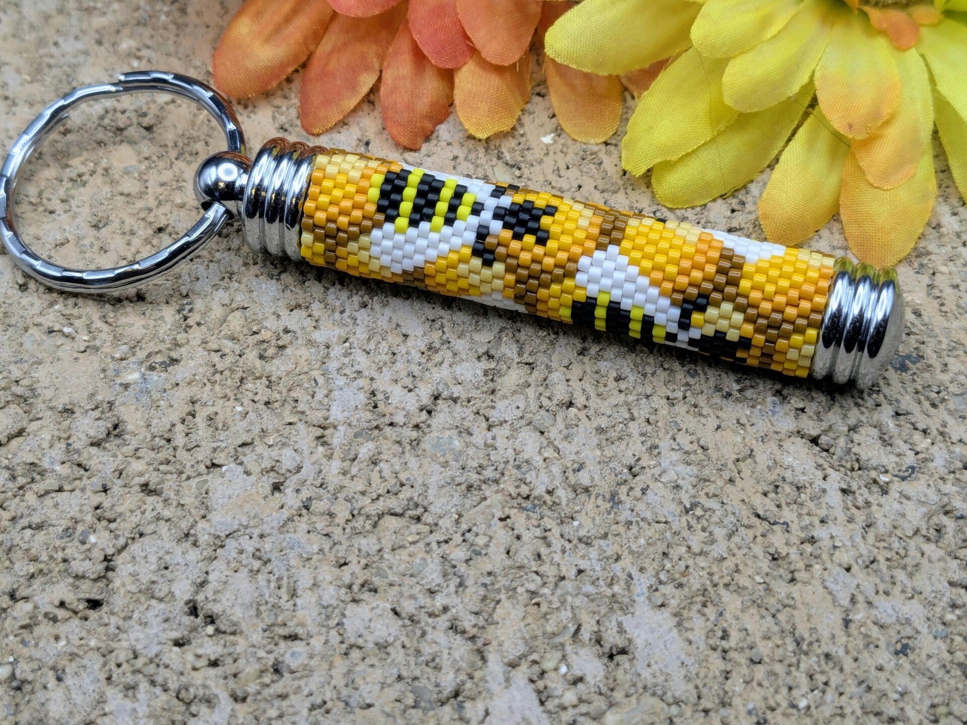 Perfect for the bee lover! Beaded metal keychain with a secret/hidden compartment in yellow, orange, and browns with yellow, black, and white bees. Ideal for storing toothpicks or keeping some emergency money.